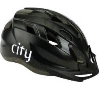 „‚City-Helm‘ mit Kopfbandverstellung und Insektenschutzgitter. Die Justierung des Kinnriemenpolsters ist umständlich. Der Helm sitzt sehr flach am Kopf und wirkt dadurch rein optisch zu klein. Reflektor hinten am Helm.“