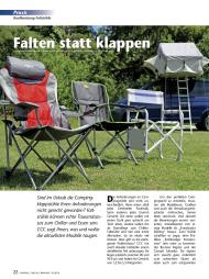 „... seine Lehne lässt sich dreifach verstellen. Er ist somit ein Zwitter aus klassischem Camping- und Faltstuhl. In seiner flachsten Position lädt er zum Abhängen ein, mit steiler Lehne sitzt es sich prima auf ihm. Die Kunststoffarmlehnen sind nicht gepolstert, aber vernünftig breit und sehr bequem. Wie die Faltstühle wird der La Palma nur aufgezogen und durch eine Verriegelung versteift. Das geht flott ...“
