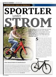 „... Am dezenten Rahmen mit innenliegender Zugführung findet sich ein Shimano-Schaltungsmix und eine langhubige Federgabel; Schwalbe-Slickreifen zeigen, dass der schlanke Sportler für flotte Trainingsrunden auf Asphalt vorgesehen ist. Mit 422 Wattstunden hat der Akku genügend Reserven für längere Touren. Auch als 25-km/h-Bike ist das Vollblut übrigens mit einer Anfahr-/Schiebehilfe ausgestattet.“