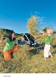 „Der ideale Kinderanhänger für Biker, schlängelt sich mühelos durchs Gelände. Mit seiner superben Federung und dem komfortablen Sitz eignet er sich auch bestens für Touren und Reisen.“