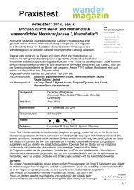 Auch 2014 setzen wir unsere erfolgreichen Langzeit-Praxistests fort. Wie gewohnt stellen wir Ihnen Wanderausrüstung in insgesamt 12 Kategorien im 2-Monatsrhythmus vor. Zusätzlich können Sie in der Printausgabe des Wandermagazins die aktuellen Berichte in komprimierter Fassung nachlesen. Diesmal geht es darum, bei Regen und Sturm, Wind und Wetter trocken zu bleiben. Im vorliegenden Membranjacken- (sogenannte ‚Hardshells‘) Test haben wir daher 6 wasserdichte und atmungsaktive Jacken in der Praxis für Sie ausprobiert. Dabei kommen sowohl mikroporöse Membranen als auch sogenannte hydrophile Membranen zum Einsatz. Auch bei den Membranmaterialien ist der Bogen weit gespannt. Neben PTFE-haltigen Membranen sind auch solche aus Polyurethan bzw. Polyester dabei.