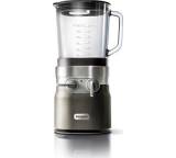 „Die zwei Klingen des robusten Standmixers laufen mit unterschiedlicher Geschwindigkeit in entgegengesetzte Richtungen. Der Mixer hat einen kräftigen 850-Watt-Motor. Sein Glasbehälter fasst 2 Liter.“