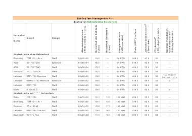 EcoTopTen liefert im Bereich „Kühlen & Gefrieren“ eine Marktübersicht zu insgesamt 351 Kühl- und Gefriergeräten. Darunter befinden sich 139 Standgeräte, die in Kühlschränke, Kühl- und Gefrierkombinationen sowie Gefrierschränke aufgeteilt wurden. Außerdem sind die Standgeräte in entsprechende Höhen-Kategorien aufgegliedert. Zusätzlich wurden für jede Kategorie typische Produkte, die am Markt erhältlich sind, vorgestellt. Zu den EcoTopTen-Kriterien zählten unter anderem hohe Qualität, angemessener und bezahlbarer Preis sowie Unterstützung eines umweltfreundlichen und kostensparenden Gebrauchs. Ebenfalls wurden Angaben zum Nutzinhalt, zu den jährlichen Gesamtkosten und zu den weiteren Ausstattungsmerkmalen aufgeführt. Die Modelle sind innerhalb der Marktübersicht nach ihrem Nutzinhalt sortiert. Einige Produkte sind in unterschiedlichen Farbausführungen erhältlich. Dies schlägt sich unter anderem in den jährlichen Gesamtkosten nieder und wird im Produktfazit durch die Mehrfachdarstellung der Werte abgebildet. Hinweis: EcoTopTen bewertet Produkte auf Basis von Herstellerangaben und eigenen Recherchen. Für jede Produktgruppe gelten strenge EcoTopTen-Mindestkriterien, die die Produkte erfüllen müssen, um empfohlen zu werden.- 19 Kühlschränke (Standgeräte A++ bis 85 cm Höhe)