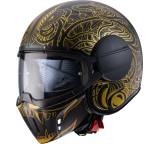 „Plus: scharfe Optik im Retrostil; variabel als Klassik-Offroadhelm oder Jethelm mit Schirm; fünf Jahre Garantie.