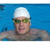 „Flache Brille für ambitionierte Schwimmer. Die ‚Timo Bracht‘ ist das Top-Modell der ‚Hydra Vision‘-Familie, die es unverspiegelt ab 29,95 Euro gibt. Die Scheiben haben eine softe Verdunkelung. Die Anpassung geht schnell. Statt Silikon wurde ein spezieller Kunststoff verwendet, der länger haltbar sein soll.“