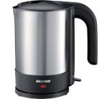 „... Benötigt für das Erhitzen von 1 l Wasser 3:59 min (maximale Leistung 1880 Watt). Vorsicht: Kanne wird sehr heiß, sie erreicht eine Außentemperatur von 90 Grad C. Achtung bei Kindern im Haushalt. Handhabung gut, aber Schrift der Bedienungsanleitung zu klein. Signallampe flimmert unangenehm. Relativ laut. Wasser ohne Fremdgeschmack.“