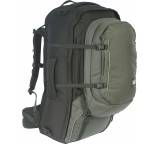 „Hauptfach mit großer Frontöffnung, Seitentasche mit Flaschenhalter, Hartschalen-Deckel (2 l), an den Schulterträgern einklippbarer Daypack. Hauptfach muss sauber gepackt werden. ... Schnörkelloser, mittelgroßer Travelpack mit praktischer Ausstattung. Sorgfältig beladen, eignet sich der Landmark 70 auch für Hüttentreks.“
