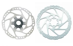 Die Centerlock-Scheibe (links) wird einfach auf die Nabe gesteckt und durch Zacken fixiert; bei der 6-Loch-Norm wird die Scheibe an die Nabe geschraubt. (Bildquelle: amazon.de)