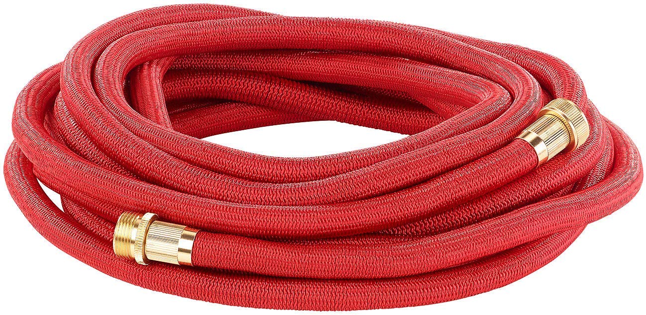 Praktisch: Flexible Gartenschläuche wie dieses Set mit Anschlüssen von Lidl/Parkside dehnen sich bei Benutzung durch den Wasserdruck in der Länge stark aus und lassen sich danach platzsparend verstauen. (Bildquelle: lidl.de)