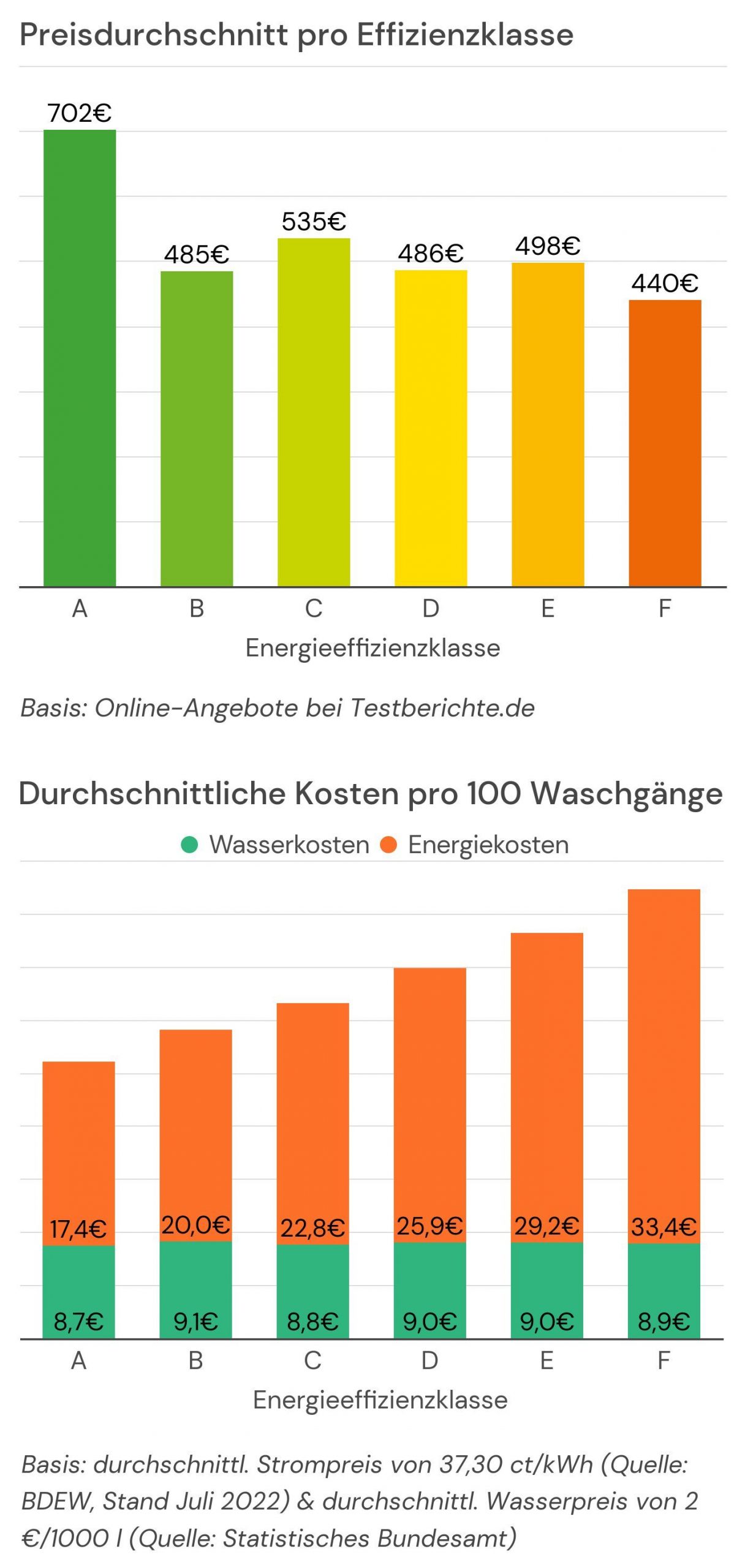 Doch Achtung: Läuft Ihre Waschmaschine mit Energieeffizienzklasse F regelmäßig vier- bis fünfmal in der Woche, was bei Familien nicht selten der Fall ist, legen Sie langfristig obendrauf. Denn bei etwa 220 Waschgängen im Jahr haben Sie Mehrkosten von fast 36 Euro gegenüber Klasse A. Anschaffungskosten plus Unterhaltskosten liegen auf zehn Jahre gerechnet also über denen von einem durchschnittlichen Klasse-A-Gerät. In die Rechnung nicht einmal einkalkuliert ist ein wahrscheinlich weiter steigender Strompreis. Selbst eine Waschmaschine mit an sich ordentlicher Energieeffizienzklasse D, ist – so kalkuliert – kaum mehr günstiger als Klasse A.