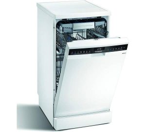 Unter den großen Namen sticht in unserer Bestenliste einer besonders hervor, wenn es um schmale, unterbaufähige Geschirrspüler geht: Siemens. Anfang 2024 bietet der Hersteller auf seiner Website drei Modelle mit einer Breite von 45 cm an, die auch frei in der Küche aufgestellt werden können. Nimmt man die Abdeckung ab, werden diese drei Modelle unterbaufähig und passen unter die Standard-Arbeitsplatte mit einer Höhe von 85 cm. Hinzu kommen fünf Geschirrspüler, die von vornherein ausschließlich für den Unterbau konzipiert wurden. Erfreulich: Die Mehrzahl der Geräte spült, gerade angesichts der kompakten Bauweise, sehr energieeffizient und ist dementsprechend in der guten Energieklasse C zu finden. Ein kleiner Teil des Portfolios befindet sich in der vom Verbrauch her noch akzeptablen Klasse E.