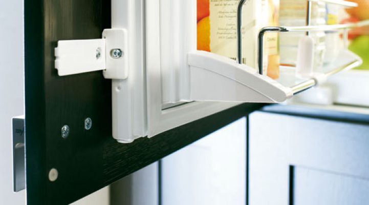 Egal, ob die Möbeltür nach links oder rechts aufgeht: Bei der sogenannten Schlepptürmontage muss auch beim Kühlschrank der Türanschlag entsprechend montiert sein. Ansonsten ist eine Kopplung der beiden Türen nicht möglich. Diese erfolgt über ein schlichtes Gleitelement, welches innen an der Paneeltür und außen an der Kühlschranktür festgeschraubt wird. Dadurch wird die Kühlschranktür automatisch mitgezogen, wenn Sie die Möbeltür öffnen.