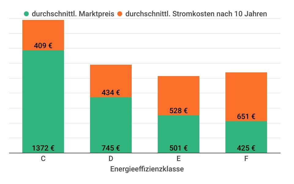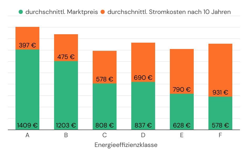 Aus Sicht der Nachhaltigkeit gilt natürlich: Je energieeffizienter, desto besser. Aber nicht jeder kann und will rund 1.000 Euro Anschaffungskosten aufbringen. Das beste Preis-Leistungs-Verhältnis bieten andere Klassen, die den Spagat zwischen moderatem Preis und Umweltfreundlichkeit schaffen und sich so zu Preis-Leistungs-Siegern mausern.