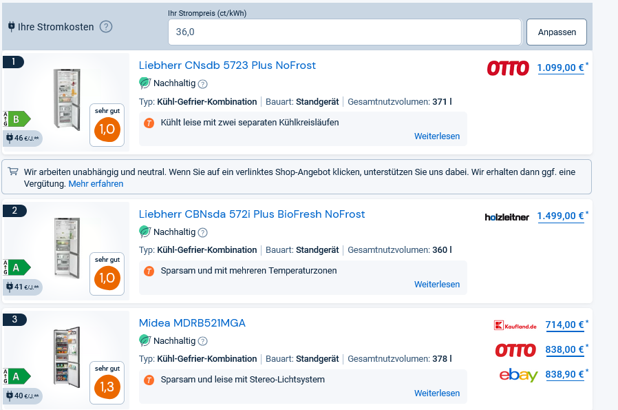Berücksichtigt wurden alle seit 2021 bei Testberichte.de gelisteten Kühl-Gefrier-Kombinationen mit Online-Angebot. Basis für die Betriebskosten ist der durchschnittliche Strompreis je Kilowattstunde in Deutschland (36 Cent, Quelle: verivox.de)