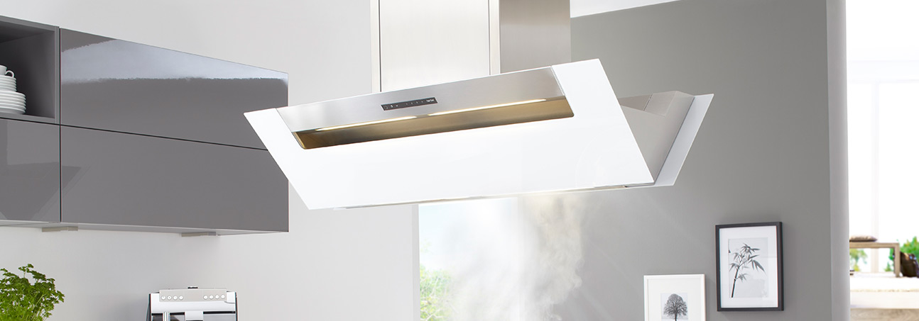 Eine Alternative zu dieser Bauform sind runde Abzugshauben. Sie sehen aus wie Zylinder, die von der Decke herunterhängen, und sollen durch ihre runde Form weniger massiv wirken – obwohl sie die gleichen Durchmesser erreichen wie ihre eckigen Verwandten. Aber auch sie haben einen Nachteil: Anders als die klassischen Schirmhauben sind sie nicht als „Kopffrei“-Version mit schräg gestelltem Schirm erhältlich, das heißt, der Zylinder hängt entweder direkt vor Ihrem Kopf oder muss höher hängen und dafür deutlich mehr Leistung mitbringen.Lieber etwas mehr Leistung einkalkulieren