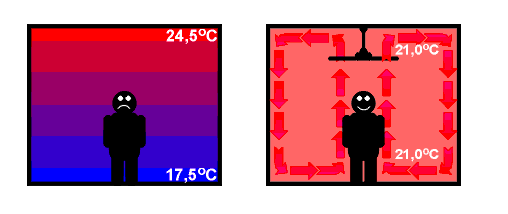 Heizen Sie im Winter den Raum, sammelt sich die warme Luft unterhalb der Decke und bleibt dort (linke Abbildung). Mithilfe eines Deckenventilators wird sie wieder nach unten geführt und es entsteht eine angenehme Raumtemperatur (rechte Abbildung). (Bildquelle: ventilator.de)