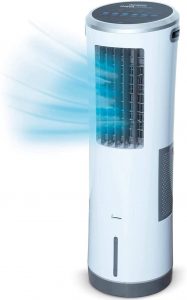 „Spürbare Kühlwirkung dank Wasserverdunstung“, meint das ETM Testmagazin zum Beurer LV 50 Fresh Breeze. Doch im Unterschied zu Kühlsystemen mit Abluftschlauch können solche Verdunstungskühler die Luft nicht entfeuchten. Zusätzlich sinkt die Effizienz, je feuchter die Raumluft ist. (Bildquelle: amazon.de)