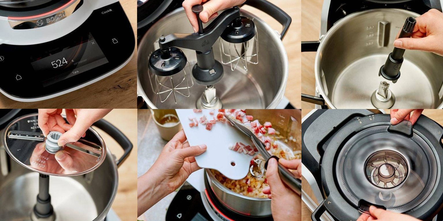 Die meisten Kochschritte erledigt beim Thermomix ein Universalrührelement. Das ist überaus praktisch, denn während des Kochens müssen Sie den Einsatz nur ganz selten wechseln. Vorwerk spricht Köchinnen und Köche an, die es möglichst einfach lieben. Bosch hingegen folgt einer anderen Philosophie und setzt auf Spezialwerkzeuge wie etwa einen Zwillings-Schneebesen, und lockt Kunden, denen viel an einem möglichst perfekten Ergebnis gelegen ist – und die dafür gern in Kauf nehmen, die Einsätze zwischen den einzelnen Rezeptschritten zu wechseln. Die Folge: In den ersten Praxistests kredenzte der Cookit fluffige Desserts wie etwa Mousse au Chocolate auf einem meist höheren kulinarischen Niveau als der Thermomix. Fazit: Beim Thermomix sparen Sie beim Kochen mehr Zeit als beim Cookit, dafür punktet dieser mit besseren, professionelleren und oft auch ansehnlicheren Ergebnissen.