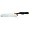 Vom kleinen Schälmesser bis zum 24 Zentimeter langen Fleischmesser erstreckt sich die Palette von über 50 Kochmessern, die Fiskars in vier verschiedenen Produktfamilien anbietet. „Kitchen Smart“ ist eine eher schlicht gestaltete Serie mit einfachen, aber dennoch ergonomisch geformten Kunststoffgriffen. Messer der Serie „Functional“ sind mit gummierten Softtouch-Griffen versehen. Die Serie „Edge“ sieht mit den in die schwarzen Griffe eingelassenen orangenen Bändern und den beschichteten, schwarzen Klingen nicht nur schick aus. Der rostfreie Klingenstahl kommt zudem aus Japan. Aus Deutschland schließlich kommt der Stahl für die Klingen der Serie „Solid“, die auch so ist wie sie heisst. Die Ergonomie der Messer ist zudem durchweg für Rechts- wie für Linkshänder geeignet.Japanische Messerformen für europäische Hände