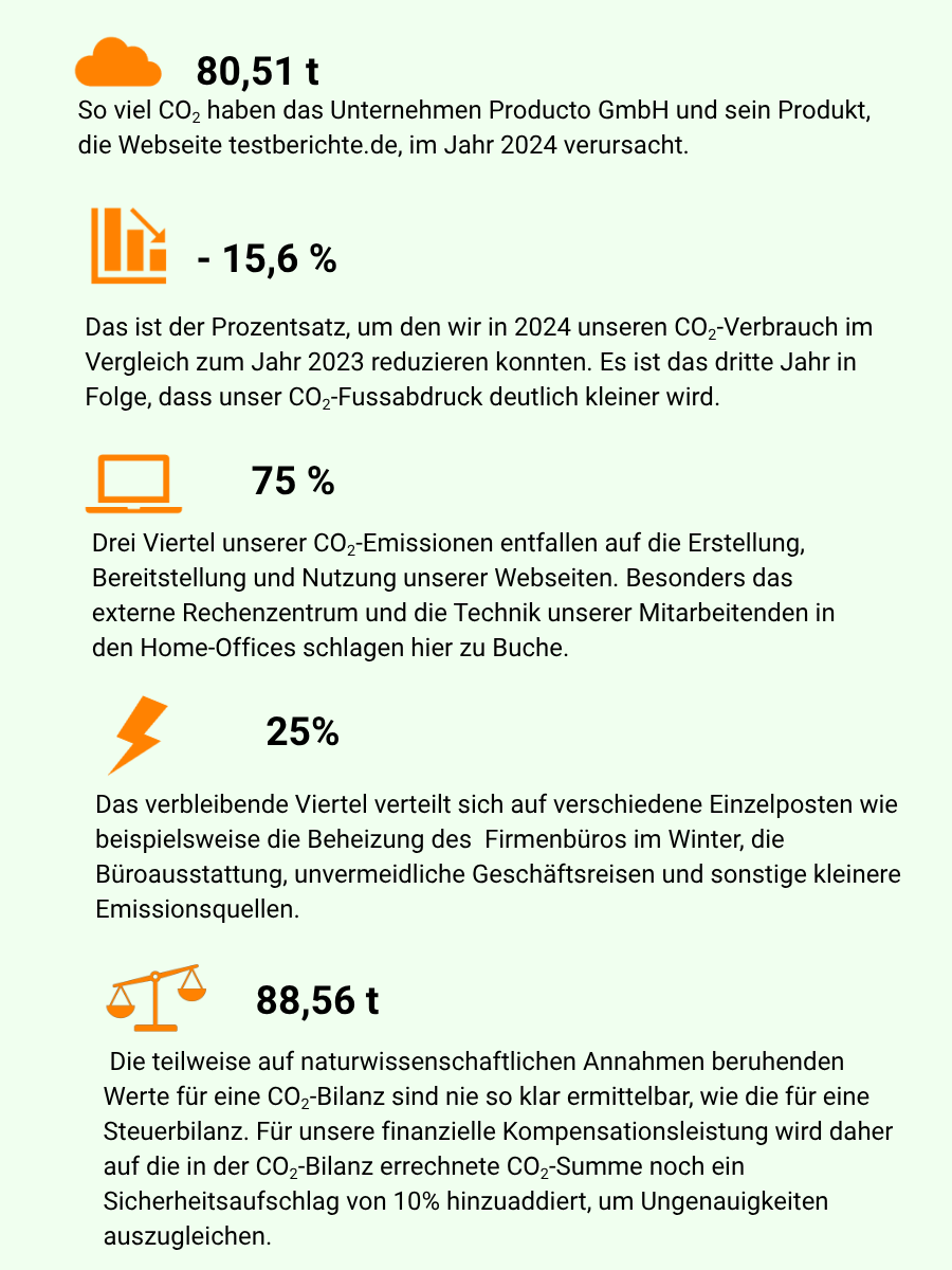 Als Onlinemedium und Produktdatenbank stellen wir keine Produkte her, die Transportwege verursachen oder für die bei der Herstellung klimaschädliche Rohstoffe gebraucht werden. Unser Produkt ist unsere Webseite www.testberichte.de, auf der wir tagtäglich Nutzer:innen beraten und dabei unterstützen, bewusster zu konsumieren. Hierbei wird klar: Unseren größten Emissionsfaktor können wir nicht reduzieren, da er hauptsächlich auf indirektem Weg verursacht wird: durch den Traffic der User:innen auf unserer Seite, die unsere Beratungsleistung in Anspruch nehmen, um gute Kaufentscheidungen zu treffen.