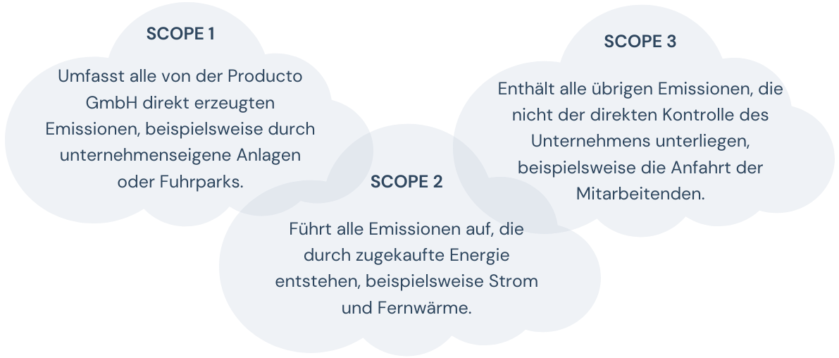 Gemäß dem GHG Protocol (Greenhouse Gas Protocol oder dt. „Treibhausgasprotokoll“) werden die verschiedenen Emissionsquellen drei Bereichen (Scopes) zugeordnet.