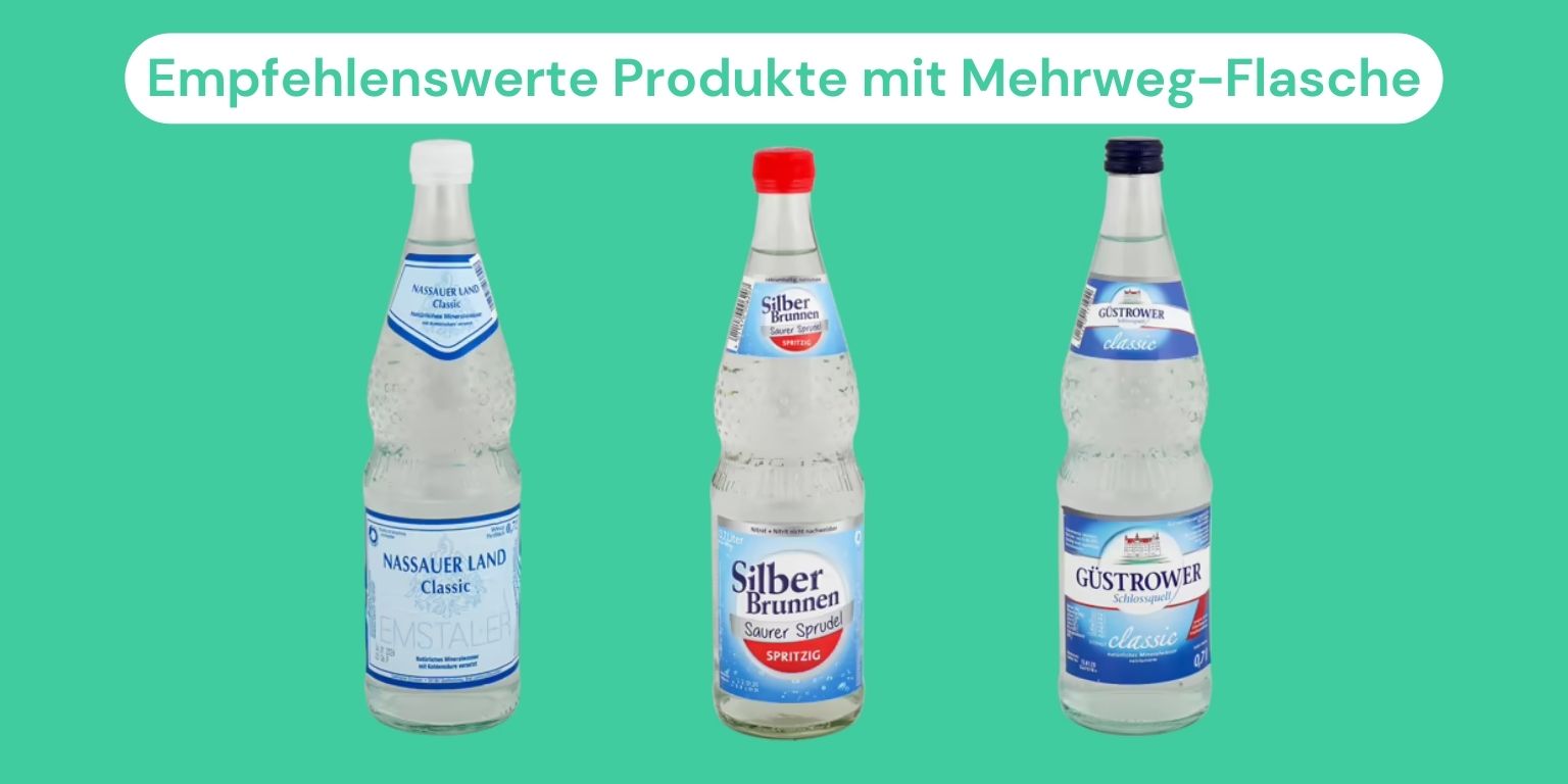 Besser für die Umwelt als Einweg: Die günstigsten Mineralwässer, die in Glas-Mehrweg-Flaschen kommen, sind im ÖKO-TEST das Nassauer Land Classic (43 Cent/Liter), das Silber Brunnen Saurer Sprudel Spritzig (50 Cent/Liter) und das Güstrower Schlossquell Classic (50 Cent/Liter).