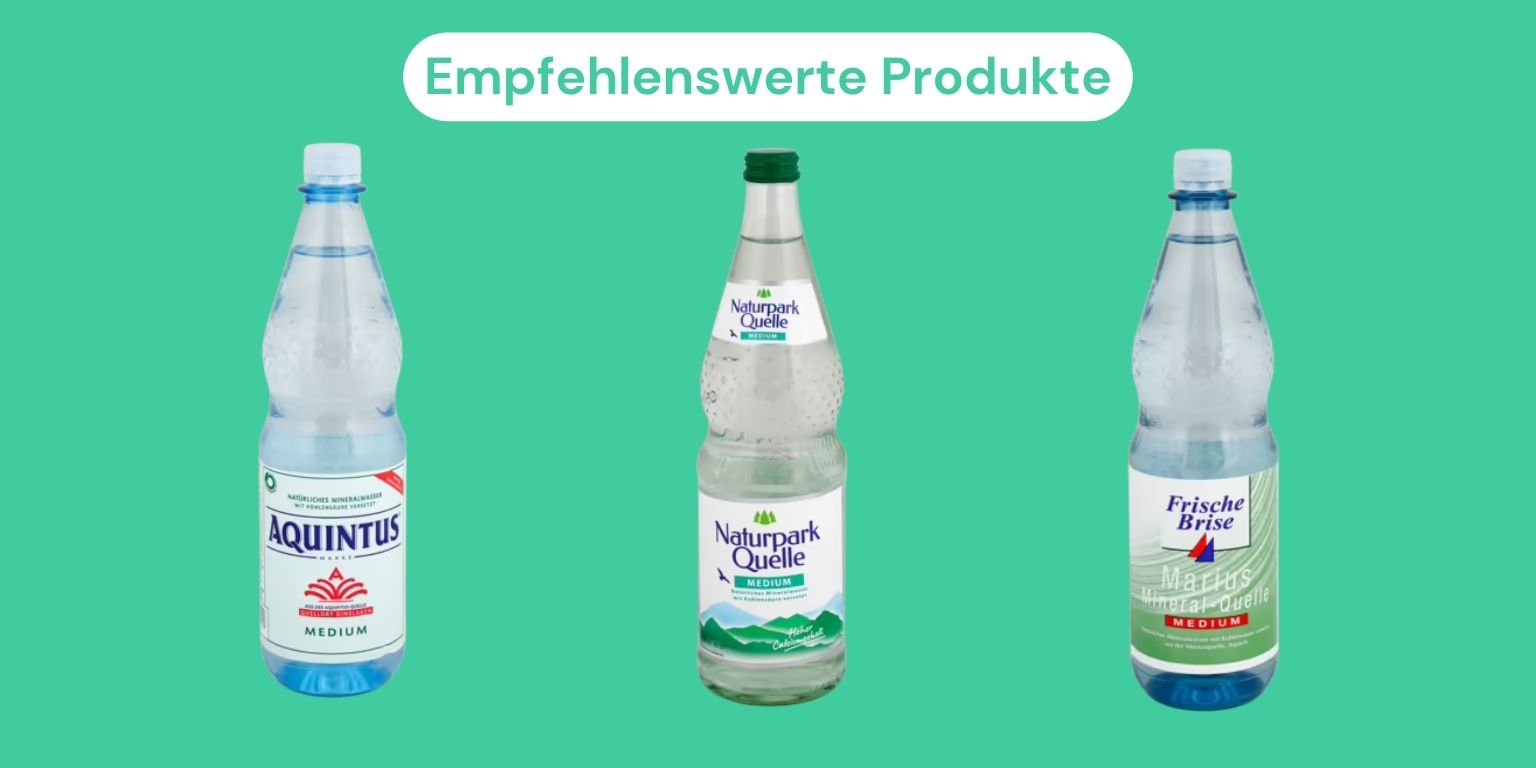 Insgesamt 29 natürliche Mineralwässer mit Kohlensäuregehalt Medium wurden geprüft – 8-mal vergab das Magazin die Note „sehr gut“ und 18-mal die Note „gut“. Unter den Topprodukten mit der Bestnote 1,4 finden sich auch günstige Wässer von Supermarkt-Eigenmarken, etwa das K-Classic Medium von Kaufland, das Saskia Jessen Medium von Lidl und das Medium Quintus Quelle von Penny. Das beste Markenwasser kommt von Aquintus. Es ist allerdings 22 Cent teurer als seine Konkurrenten aus dem Discounter, für die nur 18 Cent pro Liter fällig werden.