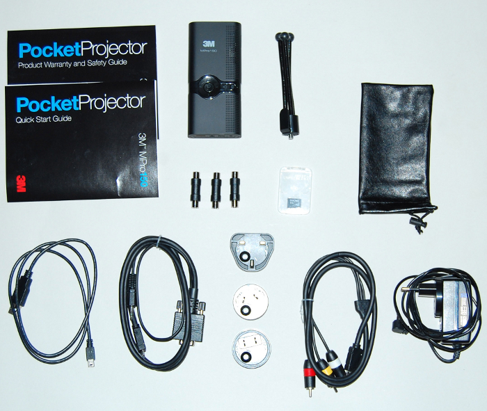 Der MPro 150 kommt mit MS Word, MS Power Point und MS Excel zurecht, unterstützt TXT-Dateien, PDF-Dokumente, BMP- und JPEG-Fotos sowie MP4- beziehungsweise H.246-Videos. Die genannten Dateien werden per USB auf den internen 1-Gigabyte großen Flash-Speicher kopiert. Außerdem ist eine zwei Gigabyte große Micro-SD-Karte im Lieferumfang enthalten, mit der sich die Kapazität im Handumdrehen erweitern lässt. Im Test brauchten wir rund 25 Minuten, um eine Datei mit 1,5 Gigabyte auf die Speicherkarte zu laden. Alle genannten Formate wurden problemlos erkannt. Für externe Zuspieler hat 3M eine Mini-VGA-Buchse verbaut,