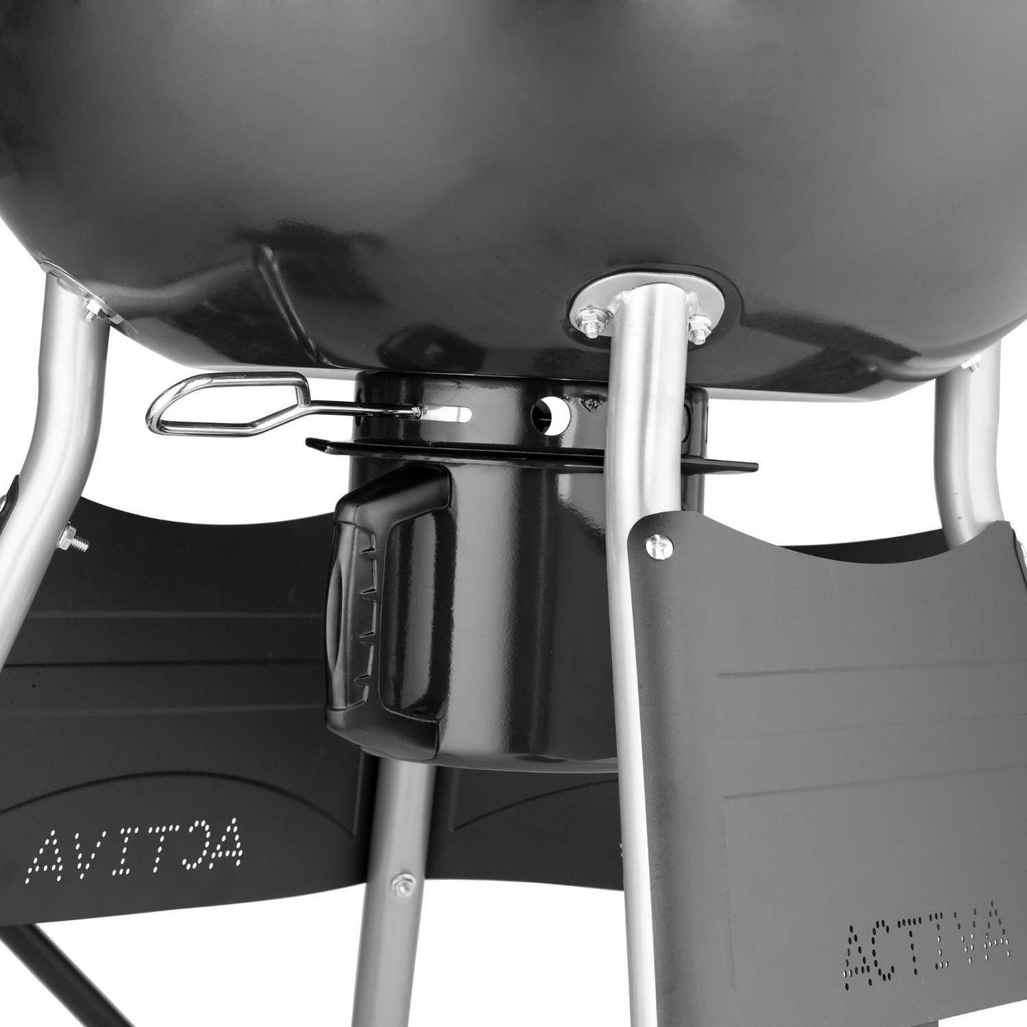 Erfreulicherweise verfügt der Grill nicht nur über einen Auffangbehälter für die Asche. Der Behälter besitzt darüber hinaus auch eine regelbare Luftzuführung, ein Ausstattungsmerkmal, das sich beim Anfeuern auszahlt, aber auch während des Grillens zur Kontrolle und Regulierung der Hitzeentwicklung nützliche Dienste leistet. Zusätzlich dazu finden sich auch im Deckel zwei Ventilationsöffnungen. Zusammen mit der Größe der Grillwanne, in der sich die Kohlen am Rand oder auf einer Seite aufschichten lassen, eignet sich der Activa daher gut für das indirekte Grillen. Auf der XL-Grillfläche können daher auch Fleischstücke im XL-Format gegrillt werden. Leider ist in den Deckel kein Thermometer eingearbeitet. Grillfans mit Heimwerker-Fähigkeiten sollten daher, falls öfter indirekt gegrillt werden soll, den Grill vor der Inbetriebnahme mit einem Thermometer nachrüsten.