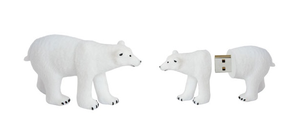 Der USB-Stick nennt sich deshalb auch logischerweise WWF Polar Bear USB Flash Drive. Er ist 66 x 37 x 21 Millimeter groß, überragt demnach die handelsüblichen USB-Sticks um einiges – aber immerhin soll er ja auch ein 40:1-Modell eines echten Eisbären abgeben, weswegen sein Silikonfell ein bisschen die Textur eines echten Fells besitzt. Er ist erhältlich in den Größen 1, 2, 4, 8 und 16 GB. Die Kosten für den Bären steigern sich dementsprechend in den Schritten 9,95 Dollar, 12,95 Dollar, 18,95 Dollar, 24,95 Dollar und schließlich 42,95 Dollar.