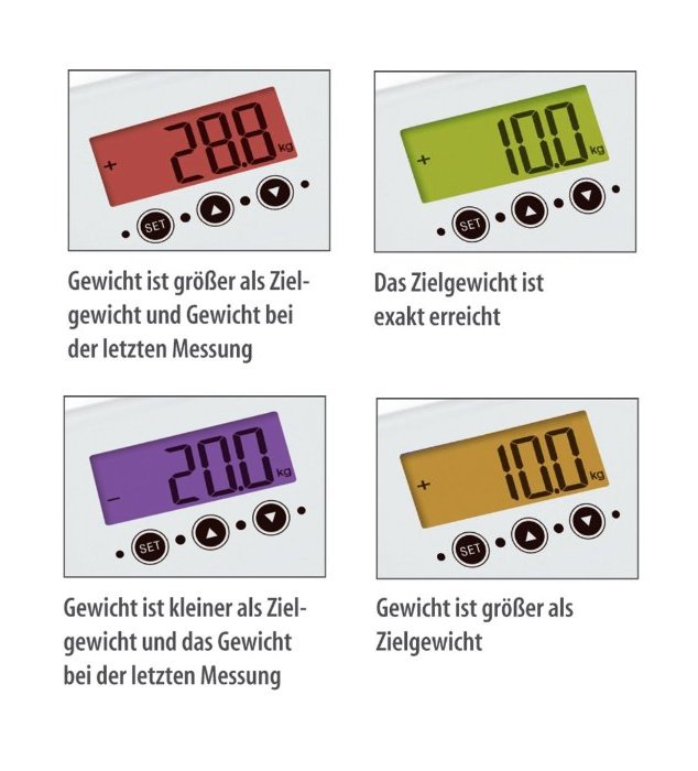 Eingegeben wird das Zielgewicht über berührungsempfindliche Tasten, wobei die Personenwaage von ADE Speicherplatz für bis zu zehn Anwender zur Verfügung stellt. Bei Bedarf kann sich demnach eine komplette Großfamilie von der ADE kontrollieren lassen. Nach der Eingabe zeigt das Display nicht nur das Gewicht an, sondern schaltet automatisch in den Bewertungsmodus um: Das Display leuchtet zum Beispiel rot auf, sofern das Gewicht der letzten Messung überschritten wurde, grün dagegen signalisiert wie im Straßenverkehr Entwarnung und freie Fahrt. Eine lilafarbene Anzeige wiederum gibt das Unterschreiten der Gewichts der letzten Messung kund und damit die Nachricht, dass der Benutzer auf dem besten Weg ist – doch damit soll es genug sein, das Repertoire der Waage umfasst nämlich noch weitere Signalfarben. Die Obergrenze für sämtliche Kontrollgänge mit Hilfe der ADE liegt bei 150 Kilogramm, Erfolg beziehungsweise Misserfolge auf dem Weg zum Idealgewicht werden erbarmungslos in 100-Gramm-Schritten angezeigt. Nach jedem Wiegevorgang schaltet sich die Waage automatisch ab, um die Batterien zu schonen. Erwähnenswert ist außerdem noch, dass die digitale Anzeige recht großzügig ausfällt. Das dafür zuständige LCD-Feld misst üppige 82 mal 43 Millimeter.