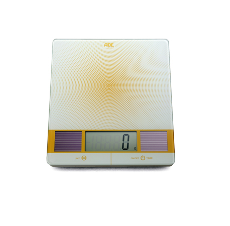 Die Solarzellen selbst wiederum sind direkt in die Wiegefläche eingearbeitet und fallen daher überhaupt nicht auf, zudem ist die Fläche recht ansprechend designt und macht ganz im Gegenteil sogar optisch einiges her. Damit auf jeden Fall auch bei schlechten Lichtverhältnissen ein reibungsloser Betrieb der Waage gewährleistet ist, ist die Waage in puncto Energieverbrauch recht anspruchslos. So genügt ihr ein Licht von gerade einmal 100 Lux, um sie mit Saft zu versorgen. Selbst bei sehr schummriger Beleuchtung, die zudem nicht einmal von einer natürlich Quelle herrühren muss, kann also mit der Waage in der Küche gearbeitet werden. Die maximale Tragkraft beträgt dabei fünf Kilogramm, die wiederum im Unterschied zu den meisten ihrer Kolleginnen in 2-Gramm-Schritten gemessen werden – Standard sind eigentlich 1-Gramm-Schritte. Für die gängigen Abwiegearbeiten beim Kochen und Backen reicht die etwas gröbere Einteilung trotzdem voll und ganz aus. Wie selbstverständlich hingegen beherrscht die ADE die Zuwiegefunktion (Tara), außerdem schaltet sie sich von alleine ab, wobei leider keine näheren Informationen darüber vorliegen, wie flott die Waage damit ist. Erfahrungen mit anderen Waagen belegen nämlich, dass eine zu schnelle Abschaltung speziell bei der Verwendung der Tara-Funktion zu einem ziemlich großen Ärgernis werden kann. Dafür fällt das Anzeigedisplay mit fast 10 x 4 Zentimetern außergewöhnlich großzügig aus, die Bedienung wiederum erfolgt über berührungsempfindliche Tasten.