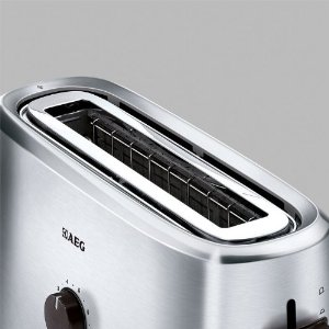 In puncto Funktionsumfang bietet der AEG selbstverständlich fast alles, was derzeit von einem Toaster erwartet werden kann, das heißt, er kann Rösten, Auftauen und Aufwärmen. Lediglich das einseitige Rösten von zum Beispiel Bagels gehört nicht zu seinem Repertoire. Der Brötchenaufsatz wiederum ist integriert und muss daher nicht separat verstaut werden – ein wichtiges Kriterium für viele Kunden. Das Edelstahlgehäuse hebt den AEG aus der Masse etwas heraus, obwohl das Material nicht mehr so selten anzutreffen ist. Trotzdem ist er mittlerweile erschwinglich geworden. Ursprünglich auf 75 EUR angesetzt, ist er momentan auf Amazon für sehr moderate und daher attraktive 45 EUR zu haben.