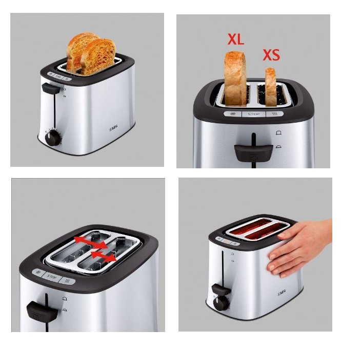Recht edel vom ErgoSense AT 5210 und daher auch recht komfortabel ist das Angebot an insgesamt acht Bräunungsstufen, und die üblichen Komfortfunktionen wie Aufback- und Aufwärmfunktion, Stopptaste und Brötchenaufsatz fehlen ebenfalls nicht. Hervorzuheben ist noch das von AEG „Cool-Touch“ benannte Gehäuse, das Verbrennungen an der Edelstahlwand unmöglich machen soll, sowie der High-Lift-Hebel, mit dem sich auch kleinere Toastscheiben ohne verbrannte Fingerspitzen aus den Schlitzen bergen lassen sollen – speziell im Falle der beiden letztgenannten Vorzüge darf man auf die ersten Erfahrungsberichte gespannt sein.