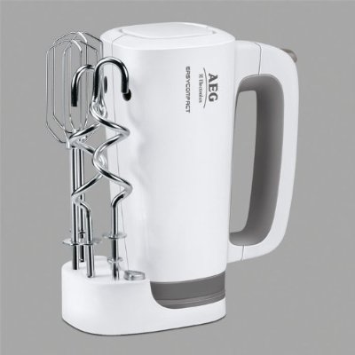 Denn im Grunde genommen bietet der AEG so ziemlich alles, was ein solider Handrührer können muss. Die Motorleistung beträgt auf dem Papier 300 Watt, Kunden berichten jedoch, dass sich mit dem Handrührer sämtliche Teigarten zum Beispiel ohne nennenswerte Probleme herstellen lassen – selbst vor schweren Hefeteigen muss man also nicht zurückschrecken. Zur Auswahl stehen insgesamt drei Geschwindigkeitsstufen, die in den meisten Fällen sicherlich ausreichen werden – wer unbedingt mehr Stufen benötigt, muss für diesen Komfort auch deutlich tiefer in die Tasche greifen. Gelobt wird durch die Bank aber nicht nur die starke Motorleistung des Geräts, sondern auch dessen Handling. Mit rund 1.400 Gramm nicht unbedingt ein Leichtgewicht, liegt das Rührgerät trotzdem gut in der Hand – vermutlich ist der Schwerpunkt sehr gut austariert – und macht selbst bei längeren Rührsessions keine müden Arme. Äußerst praktisch wiederum ist die Möglichkeit, das gerät senkrecht im mitgelieferten Aufbewahrungssystem abzustellen. Es kann darüber hinaus auch an der Wand befestigt, so dass das Rührgerät jederzeit sofort zur Hand ist. Zum Lieferumfang schließlich gehören die obligatorischen Rühr- und Knethaken.
