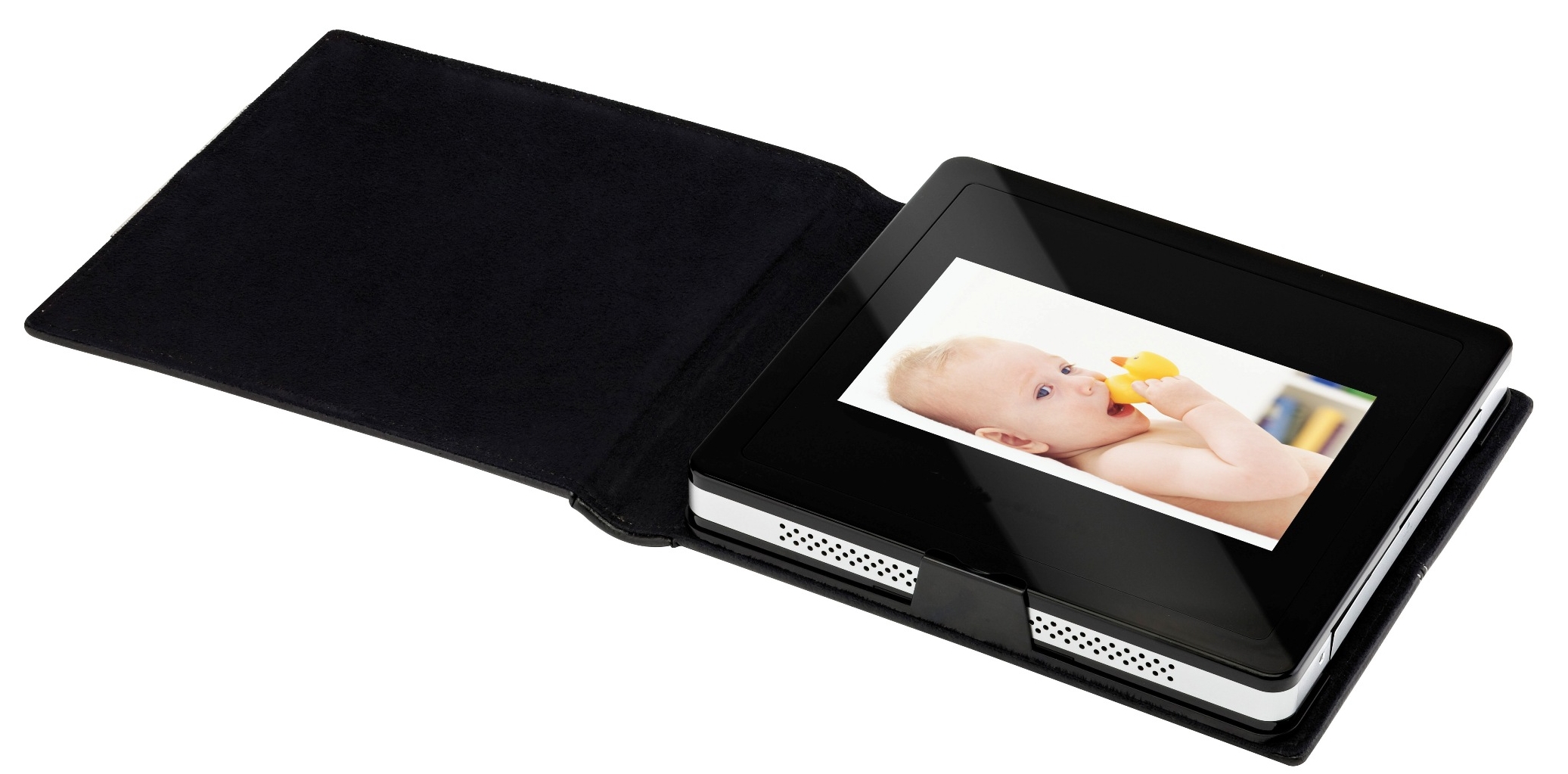 Eigentlich ist der AgfaPhoto AF8070 ein digitaler Bilderrahmen, doch das sieht man ihm auf den ersten Blick nicht an. Das 7 Zoll große Display verbirgt sich nämlich in einem Leder-Einband, der dem Rahmen das Aussehen eines klassischen Fotoalbums gibt. Natürlich kann der AF8070 auch aus dem Einband herausgenommen und als digitaler Bilderrahmen mit einem Standfuß aufgestellt werden. Wer es jedoch ein wenig nostalgisch mag, kann sich mit dem Album auf die Couch setzen und ''blättern''. Dazu bietet der AF8070 Tasten an der Seite. Die Fotos werden im Breitwandformat 16:9 dargestellt und in 480 x 234 Pixel aufgelöst. Selbst 3-D-Effekte können vom animierten Fotoalbum dargestellt werden. Der AgfaPhoto AF8070 wird über einen USB-Anschluss oder von SD- oder MMC-Speicherkarten mit Bildern versorgt.