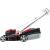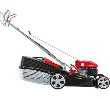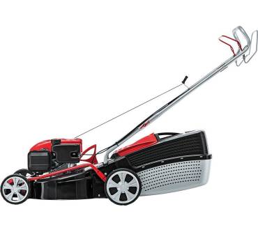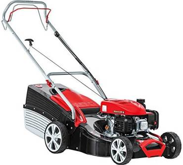 Stärken und SchwächenDie Arbeitsbreite von 46 Zentimeter ist der vom Hersteller empfohlenen Grundstücksgröße von 1.400 Quadratmeter gerade angemessen. Mit einer Schnitthöhe von 25 bis 75 Millimeter, die zentral in sieben Stufen verstellt werden kann, sind die Bedürfnisse der meisten Hobbygärtnerrinnen und Hobbygärtner gut abgedeckt. Bei einem Produktgewicht von etwa 31 Kilogramm stellt der einstufige Radantrieb eher eine willkommene Arbeitserleichterung als übertriebenen Luxus dar. Die Räder sind mit einem Durchmesser von 18 Zentimeter vorn und 22 Zentimeter hinten in erster Linie für weniger anspruchsvolle Geländeverhältnisse geeignet. Ihre Gummibereifung soll für ausreichend Halt und Traktion sorgen. Nach dem Schnitt wird das Gras in einer Fangbox gesammelt, deren Größe mit 65 Liter ausreichend gewählt ist. Ergonomische Aspekte finden keine übertriebene Berücksichtigung. Lediglich der Führungsholm aus Stahlrohr ist ergonomisch geformt, höhenverstellbar und rutschfest beschichtet ist er nicht.