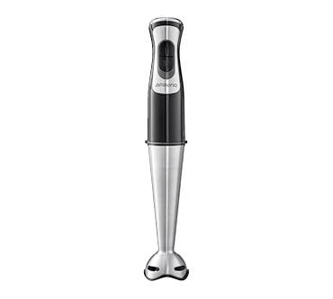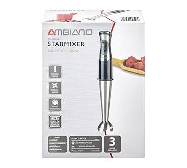 Der Ambiano-Stabmixer von Aldi Süd arbeitet mit 400 Watt. Schwere Kaliber wie hartes Gemüse oder Eis lassen sich damit nur schwer zerkleinern. Suppen, weiches Gemüse und ähnliche Lebensmittel dürfte er jedoch zuverlässig verarbeiten. Der Mixaufsatz besteht aus Edelstahl, wodurch er nicht allzu schnell überhitzen sollte. Der Hersteller legt praktischerweise einen Schneebesen bei, sodass Sie den Stabmixer auch für das Verarbeiten oder Eisschnee verwenden können. Das Kabel ist mit 130 Zentimeter ausreichend lang. Für den Preis von rund 15 Euro erhalten Sie ein einfaches, aber solides Gerät.