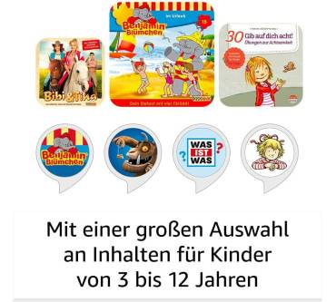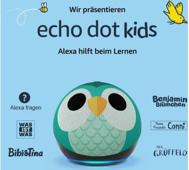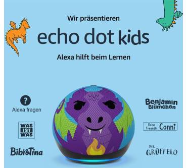 Der Echo Dot Kids ist ein auf Kinder im Alter von 3 bis 12 zugeschnittener smarter Lautsprecher. Gegenüber dem Vorgänger hat eine Überarbeitung des Designs wie auch der klanglichen Eigenschaften stattgefunden. Im Kaufpreis enthalten sind für ein Jahr die Inhalte von Amazon Kids+. Ihr Kind kann Alexa bitten, Musik oder Hörspiele abzuspielen, ihm bei Mathematik zu helfen oder eine Gutenachtgeschichte vorzulesen.