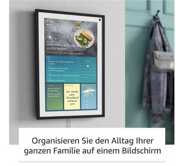 Das Echo Show 15 ist das neueste Smart Display aus dem Hause Amazon. Es ähnelt einem Tablet-Computer, verfügt aber neben einer Halterung für eine Wandaufhängung auch über einen Aufsteller. Das Display misst – wie der Name schon verrät – 15,6 Zoll und löst mit Full HD (1.920 × 1.080 Pixel) auf. Die Bildqualität und der Kontrast sind so gut, sodass auch Videostreaming Spaß macht. Das Gerät erkennt verschiedene Familienmitglieder mittels der eingebauten Kamera und kann so stets maßgeschneiderte Widgets und Inhalte anzeigen. Ein schönes Detail ist die Hardwareabdeckung, die sich mittels eines Schiebeschalters vor die Linse schieben lässt. Die Kamera zählt jedoch, was die Bildqualität anbelangt, zu den Schwachstellen des Geräts. Ebenso wie die mäßige Soundqualität.