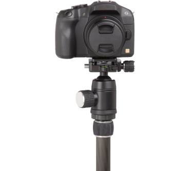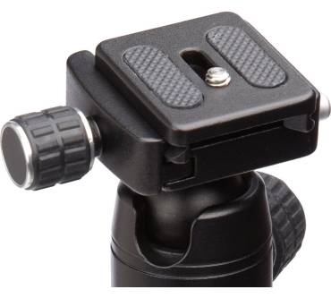 Das Reisestativ kommt mit einem Kugelkopf, der auf einer 3/8-Zoll-Schraube sitzt und somit problemlos gewechselt werden kann. Er ermöglicht es auch, die Kamera im 90-Grad-Winkel zu positionieren und so Aufnahmen im Hochformat zu tätigen. Über zwei Schrauben werden die Kugel und das waagerechte Gelenk arretiert, zudem ist der Stativ-Koppf mit einer Panorama-Skala und einer Libelle zur einfachen Ausrichtung versehen.Die Schnellwechselplatte wird ebenfalls mit einer Schraube am Stativkopf festgezogen. Eine 1/4-Zoll-Schraube dient als Verbindung zur Kamera. Allerdings ist für das Festdrehen an der Kamera ein Schraubenzieher oder zumindest eine kleine Münze notwendig.