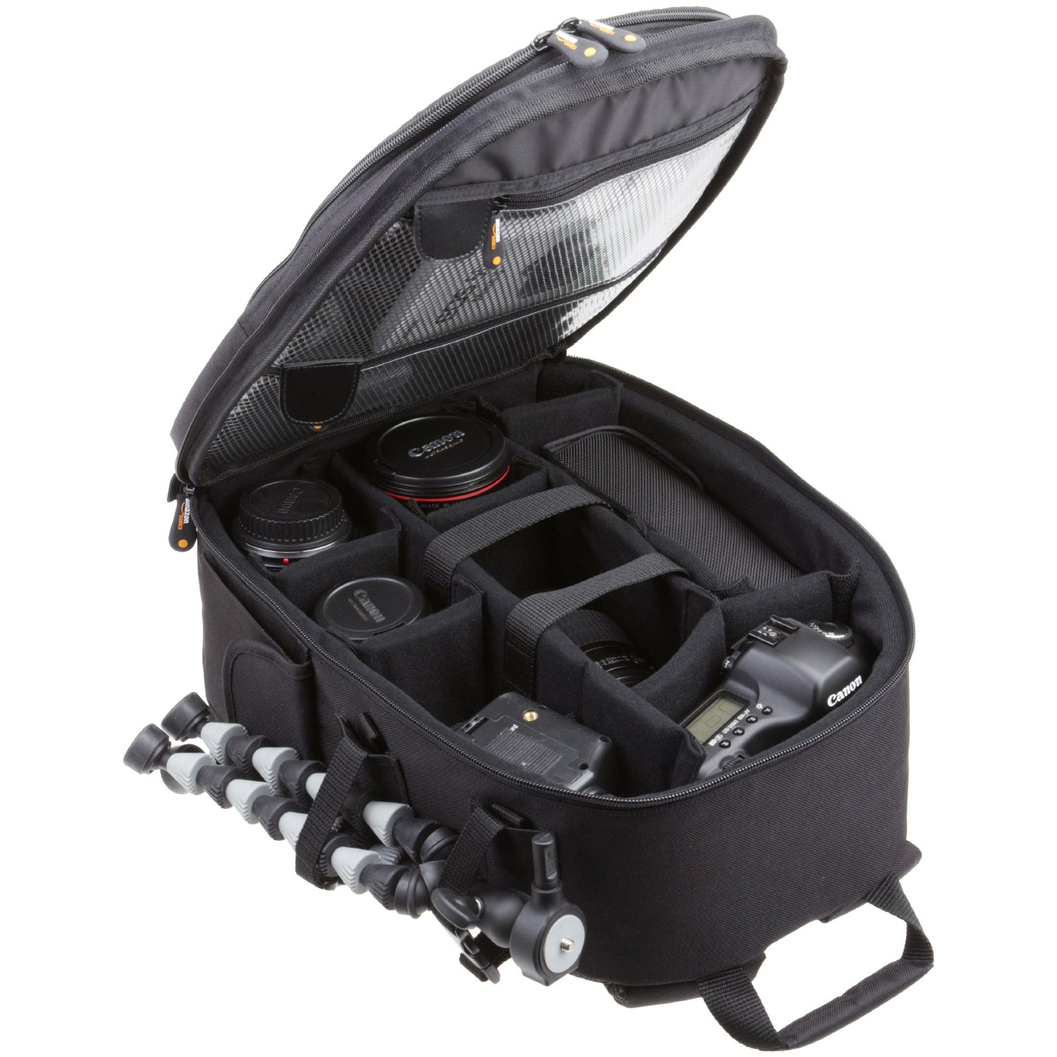 Fotografen, die bei einem Fotorucksack nicht auf ein modisches Design, sondern auf gute Aufbewahrungsmöglichkeiten für ihre Spiegelreflexkameras und das Zubehör achten, liegen beim Amazon-Schäppchen genau richtig. Der robuste Rucksack ist aus wasserdichtem Kunststoff gefertigt und verfügt über neun Fächer, deren Größe sich mithilfe der beiliegenden Klettverschluss-Fachteiler flexibel variieren lässt. Das Hauptfach bietet dabei reichlich Platz für zwei SLR-Gehäuse samt drei Wechselobjektiven, während spezielle Halteriemen fürs Mitführen eines Stativs ausgelegt sind.