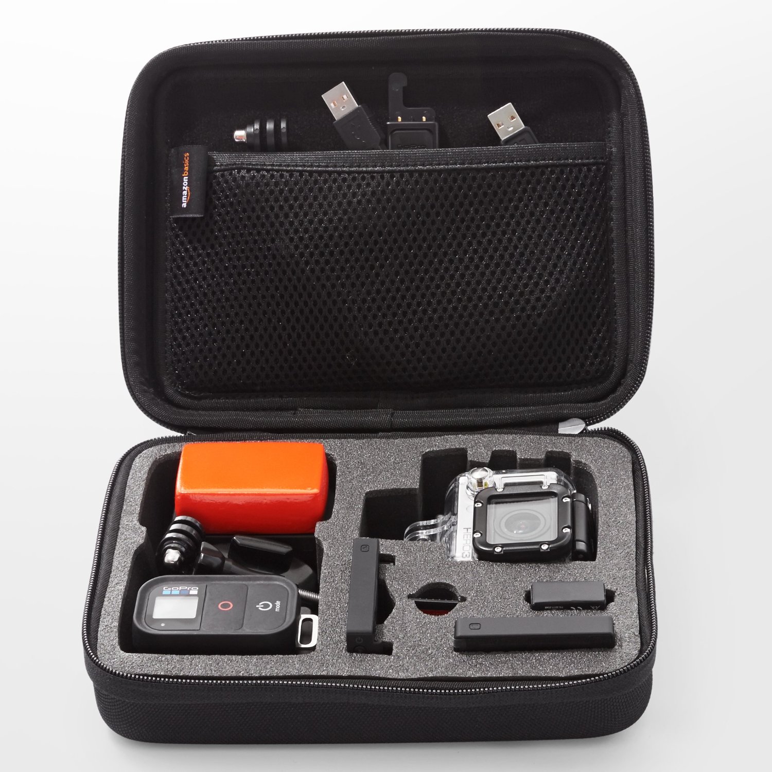 AmazonBasics bietet mit der Tragetasche für GoPro S eine simple Möglichkeit, ihre Action-Cam inklusive Unterwassergehäuse und Basiszubehör sicher und übersichtlich zu verstauen. Die Außenhülle ist verstärkt und schützt mit ihrer Steifigkeit den Inhalt. Die Kamera und das Zubehör werden durch einen Schaumstoffeinsatz zusätzlich in Position gehalten und bei Erschütterungen gesichert.