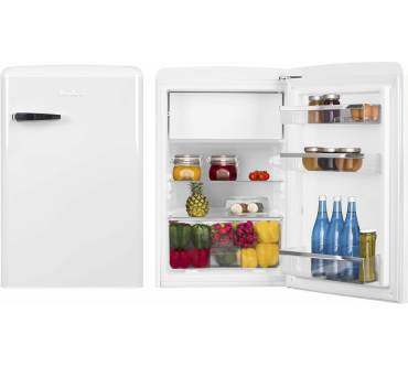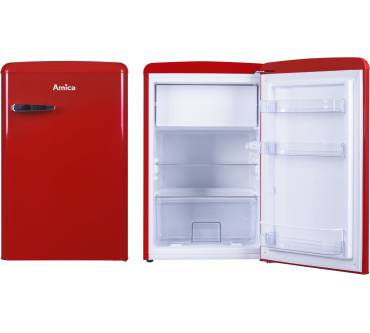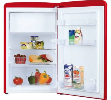 Der Tischkühlschrank von Amica präsentiert sich ganz in Rot in einem dezent gehaltenen Retro-Look. Bei einem nutzbaren Volumen von 108 Liter ist das Standgerät für kleinere Haushalte mit geringem Lagerungsbedarf interessant. Für Ihre Lebensmittel stehen Ihnen zwei Einlegeböden aus Glas zur Verfügung, von denen sich einer in der Höhe verstellen lässt. Drei Türfächer und eine transparente Gemüseschublade ergänzen das Platzangebot. Tiefkühlkost bringen Sie in dem Gefrierfach unter. Die Temperaturregulierung nehmen Sie über einen einfachen Drehregler vor, weitere Einstellungen sind nicht notwendig. Ein LED-Licht leuchtet den Innenraum aus. Bei einer Eingruppierung in die Energieeffizienzklasse D gehört der Amica nicht zu den besonders sparsamen Modellen. Die Gefrierschublade bietet Ihnen ein Volumen von 13 Liter. Pro Tag können Sie bis zu 2 Kilogramm frische Lebensmittel einfrieren.