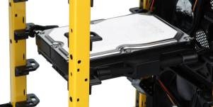 Da fragt man sich, warum die Gehäuse-Hersteller nicht schon früher auf diese simple Lösung gekommen sind. Nach der Montage der Festplattenschienen wird die die HDD nur eingehangen und schwebt gewissermaßen im Festplattenkäfig und wird rundum gut belüftet. Wie der Name LanBoy Air schon andeutet, findet man keine glatten Metallflächen sonder Mesh auf allen Seiten, sogar im Bodenbereich. Die Platzverhältnisse sind mit elf Laufwerksschächten sehr komfortabel, von denen drei für externen Einschub gedacht sind. Unterhalb der sechs Festplattenaufhängungen sind zwei Plätze für 2,5 Zoll Laufwerke vorgesehen. Werksseitig ist das PC-Gehäuse mit fünf Lüftern bestückt, die leise für kräftigen Durchzug sorgen. Wem das nicht ausreichend erscheint, kann bis zu zehn weitere Gebläse einbauen. Im Frontpanel findet man neben den üblichen Audio-Buchsen zwei USB 2.0- und einen USB 3.0-Port.