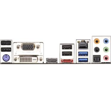 1 x DVI-D, 1 x PS/2-Tastatur, 1 x VGA, 2 x USB 3.0, 4 x USB 2.0, 1 x LAN (Gigabit Ethernet), Audio-Anschlüsse