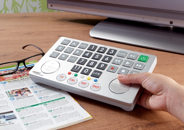 Liegt der Jumbo nicht auf dem Tisch, dann muss man ihn wohl in beide Hände nehmen. Für Menschen mit eingeschränkter Sehkraft ist die Universalfernbedienung sicher eine echte Hilfe. Bei pearl.de bekommt man sie zur Zeit für 19,90 Euro.