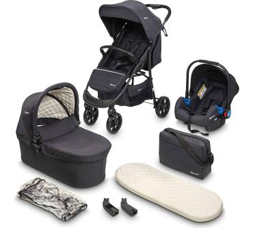 Den Kombikinderwagen Style 3in1 von BabyGo nutzen Sie ab der Geburt mit einer Babywanne, später mit Sportsitz und als Buggy. Belastbar ist er bis zu einem Gewicht von 15 Kilogramm. Das entspricht einem Alter von etwa vier Jahren. Obligatorisches Zubehör wie ein Sonnenverdeck und ein Fußsack liegen dem Lieferumfang ebenso bei wie eine Wickeltasche. Das Manövrieren vereinfachen die schwenkbaren Räder mit Dämpfungssystem und nicht zuletzt das geringe Gewicht. Die Konstruktion wiegt gerade einmal zehn Kilogramm, dazu kommen die Aufsätze. Praktisch ist auch das kompakte Faltmaß von 87 x 52 x 26 Zentimetern. Ein kleines Manko ist der Schiebegriff, der an einer Position bleibt und sich nicht auf Ihre Körpergröße anpassen lässt. Für einen Preis von aktuell rund 200 Euro ist das verschmerzbar.