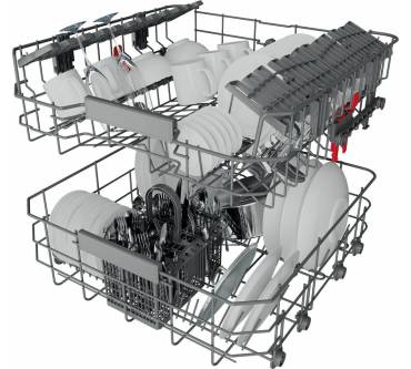In den teilintegrierten Geschirrspüler BBC 3B+26 X von Bauknecht passen bis zu 13 Maßgedecke. Für das Format ist das ein üblicher Wert. Der höhenverstellbare Oberkorb schafft im unteren Bereich mehr Raum, etwa für hohe Töpfe. Viele weitere Verstellmöglichkeiten gibt es im Innenraum allerdings nicht. Für unterschiedliche Verschmutzungsgrade und Beladungen wählen Sie aus verschiedenen Spülprogrammen, darunter aus einem mit extra hoher Temperatur von 65 Grad für starke Verschmutzungen oder einem für halbe Beladung. Per Startzeitvorwahl lässt sich der Betriebsbeginn individuell bestimmen. Zum Trocknen öffnet sich die Tür, sodass Dampf entweichen kann. Das spart Energie, wobei die Maschine in dieser Disziplin im unteren Mittelfeld liegt, sprich, bei Effizienzklasse und einem Verbrauch von 94 kWh pro 100 Eco-Spülgänge. Auffällig ist zudem der sehr hohe Wasserverbrauch von zwölf Litern, wohlgemerkt ebenfalls im Sparprogramm. Sie zahlen allerdings auch nur rund 380 Euro, was Preis und Leistung zu einem fairen Deal machen.