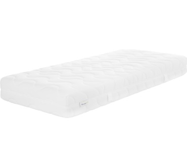 BeCo stattet das Matratzenmodell Fair Life Bio Pure Strong mit einem Kern aus nachhaltig hergestellten Komfortschaum aus. Dieser erfüllt zudem wie alle Materialien der Schlafunterlage die Bedingungen für das OEKO-TEX STANDARD 100-Label. Komfortschaum ist sehr anpassungsfähig und wirkt so Druckstellen entgegen. Allerdings weist es eine geringere Stauchhärte auf als etwa Kaltschaum und eignet sich daher vor allem für eher leichtgewichtige Nutzer. Das Raumgewicht von RG 35 deutet auf eine Lebensdauer von rund sechs Jahren hin. Interessant für Seitenschläfer ist das sogenannte ASS(Anti-Schulter-Stauch)-System. Spezielle, besonders weiche und nachgiebige Pads sollen eine und bequeme Seitenlage fördern. Der Bezug ist über zwei Reißverschlüsse abnehmbar, was die Arbeit wesentlich erleichtern dürfte. Ein kleines Manko ist die Materialzusammensetzung des Bezugs: Er besteht zu einem Teil aus PES (Polyethersulfon). Das ist zwar sehr beständig gegenüber hohen Temperaturen, kann jedoch nächtliches Schwitzen begünstigen. Für die Variante im Format 90x200 Zentimeter zahlen Sie rund 250 Euro. Der Preis ist für die Eigenschaften fair.